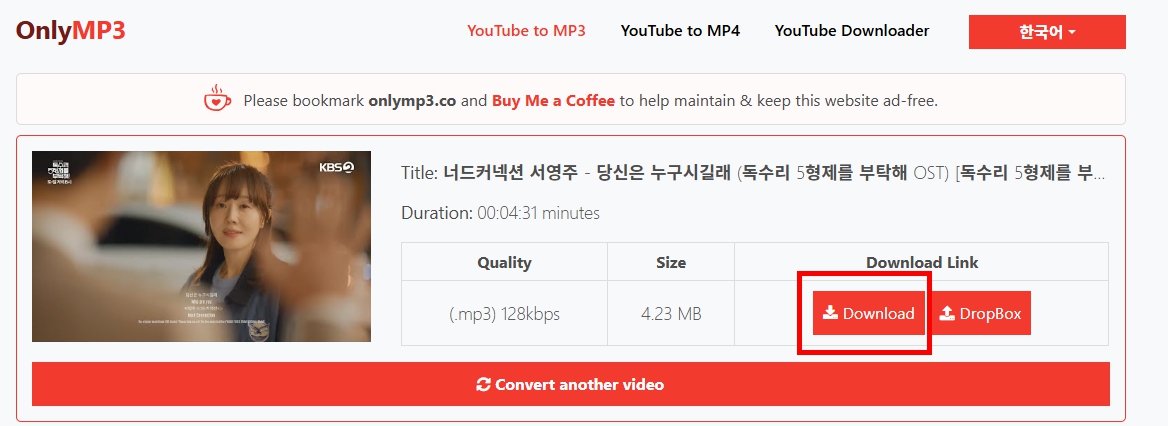 - 다운로드가 가능한 상태가 되면 ‘Download MP3’ 버튼을 클릭하여 저장
