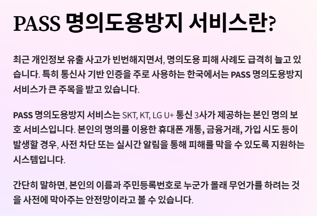 특히 통신사 기반 인증을 주로 사용하는 한국에서는 **'PASS 명의도용방지 서비스'**가 큰 주목을 받고 있는데요.